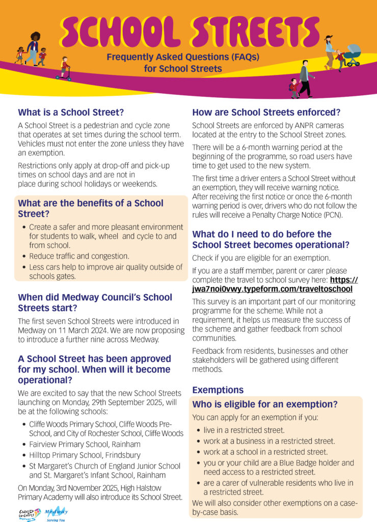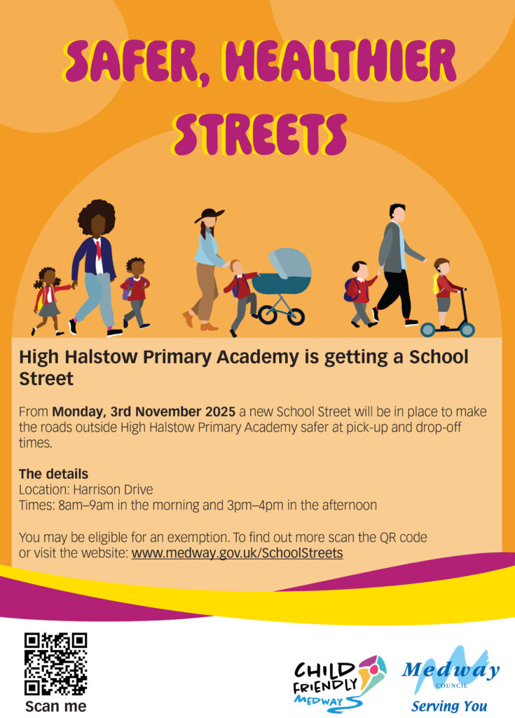 From Monday, 3rd November 2025 a new School Street will be in place to make the roads outside High Halstow Primary Academy safer at pick-up and drop-off times.